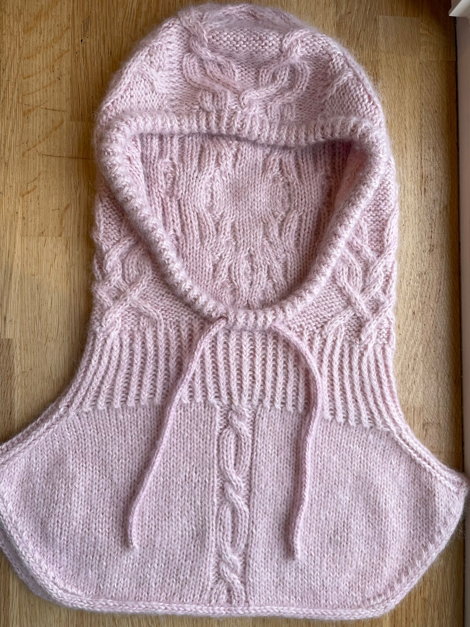 The STOCKHOLM Hood is knitted seamlessly, combining a LACE yarn in mohair and silk with a FINGERING yarn in cashmere, silk, and alpaca. The collar begins with a provisional cable cast-on, allowing for a semi-twisted 1/1 ribbing knit in the round with double increases. The hood is then worked in cables, including the face opening, and the crown is closed with short rows and decreases. Finally, the provisional stitches are picked up to knit the bib in stockinette stitch, edged with an I-cord. A casing is formed around the face opening by picking up the stitches, and then an I-cord cord is inserted.