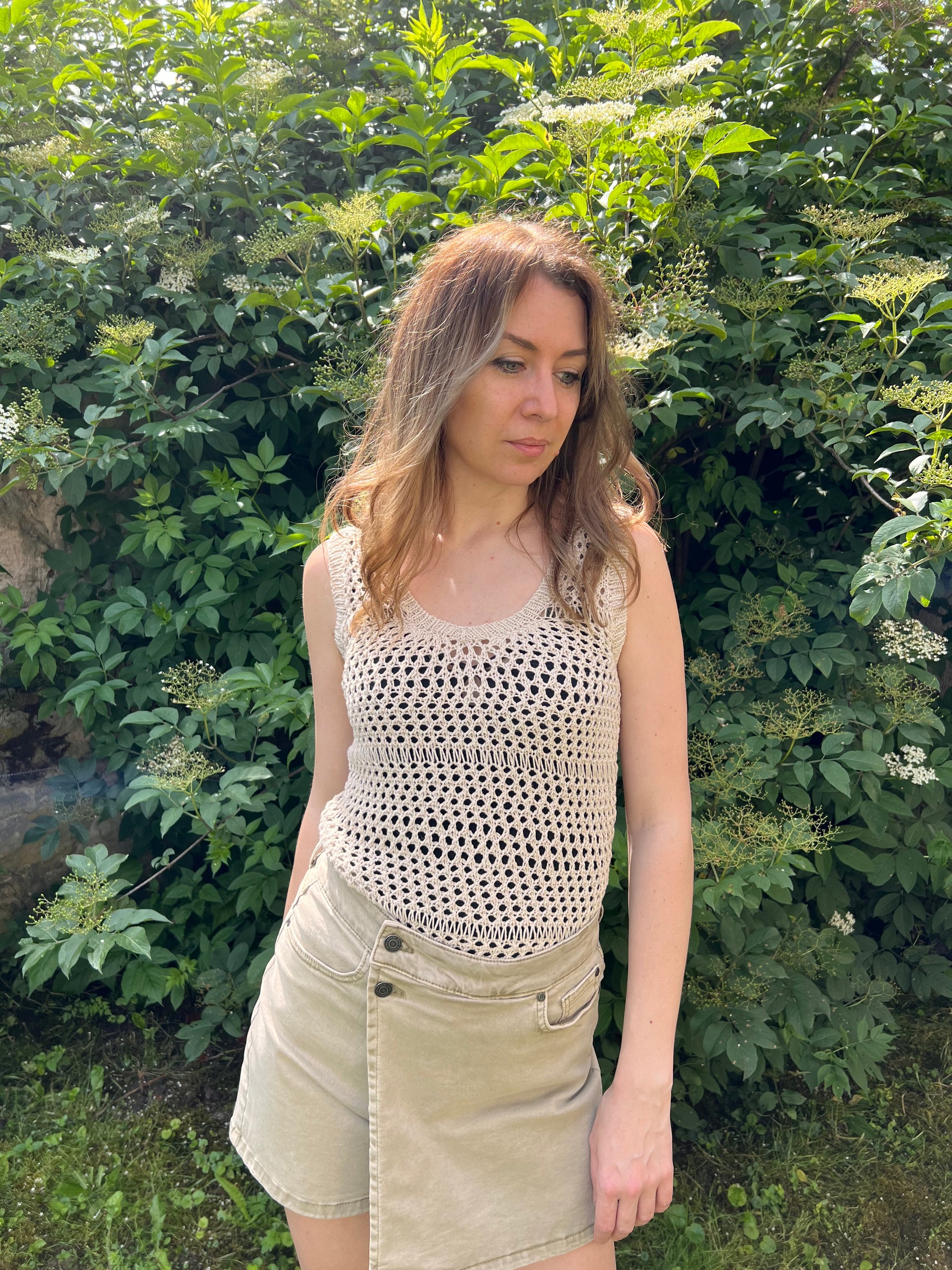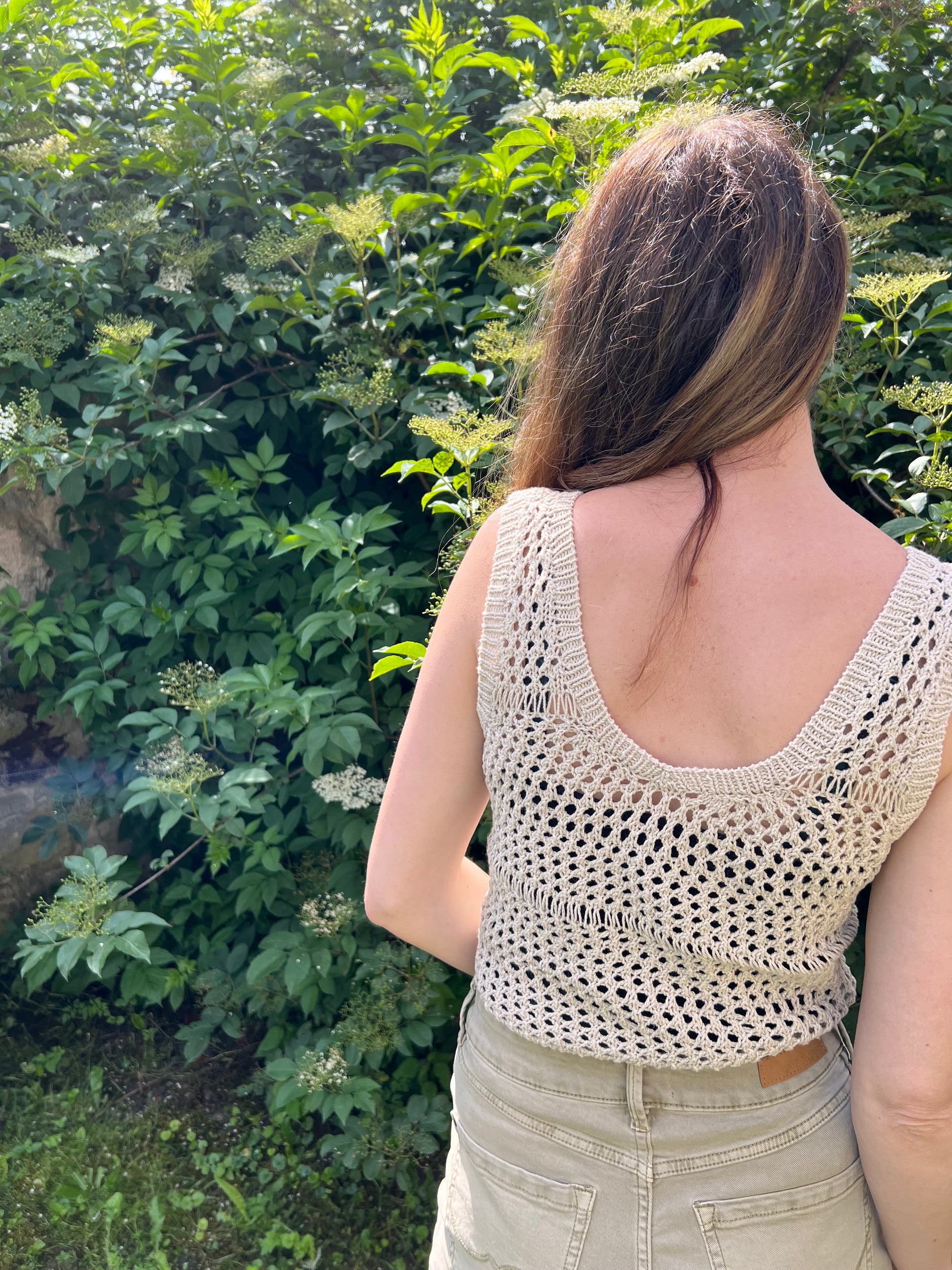 Le Brazil Top se tricote du haut vers le bas avec un fil DK/Sport en coton et lin, en points ajourés et rivière. Les épaules sont tricotées séparément, puis reliées au dos pour former un tube en rond après la création des emmanchures et de l’encolure. Le bas se termine par des côtes 1/1.
