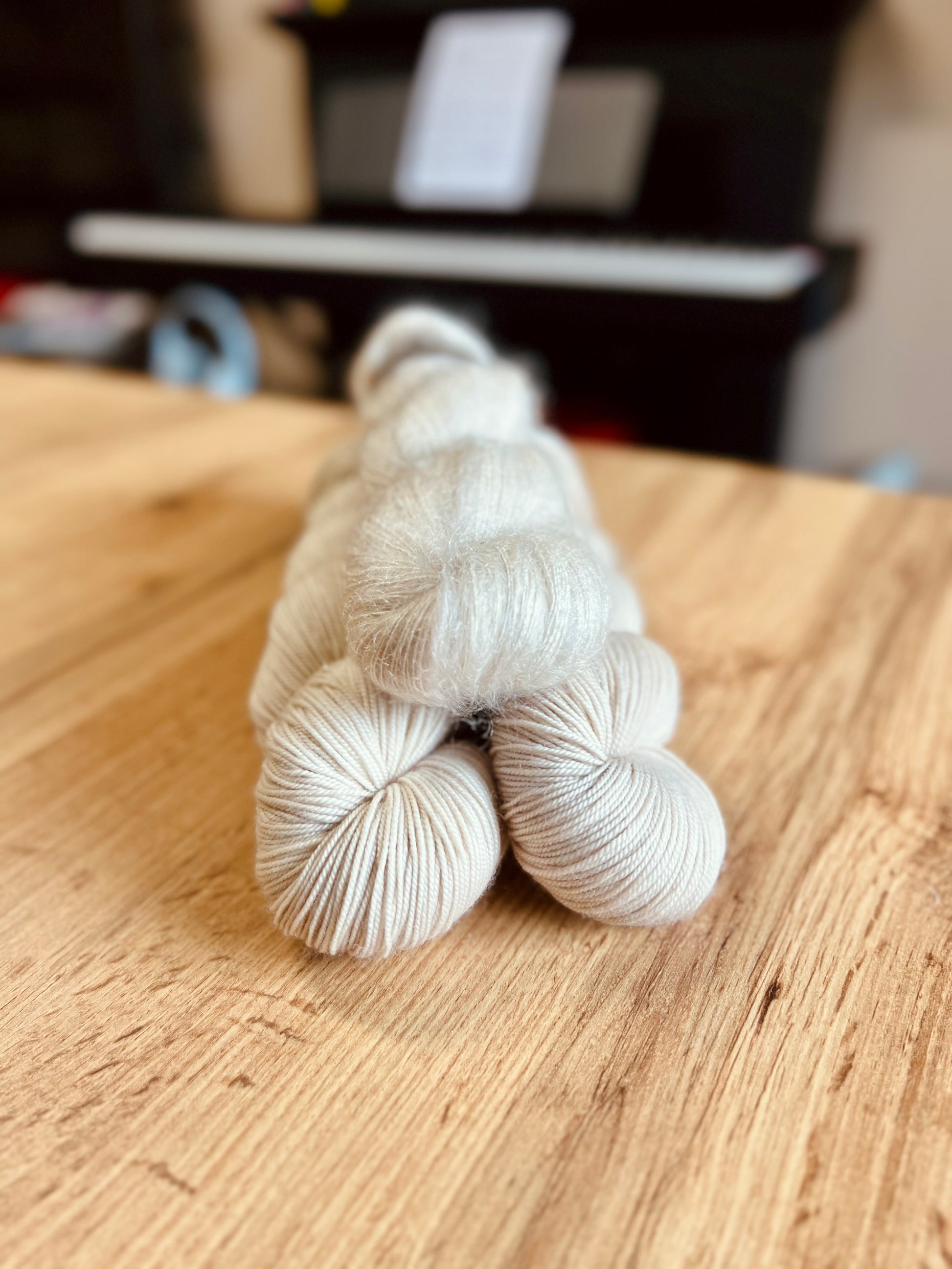 💫 Associé à la soie, il donne un fil à la fois vaporeux, lumineux et raffiné, idéal pour des pièces sophistiquées et délicates. Tricoté seul, il crée des ouvrages légers et nuageux, parfaits pour des châles ou des superpositions aériennes. Associé à un fil fingering ou DK, il apporte chaleur, profondeur et texture, sublimant vos pulls, cardigans et accessoires.