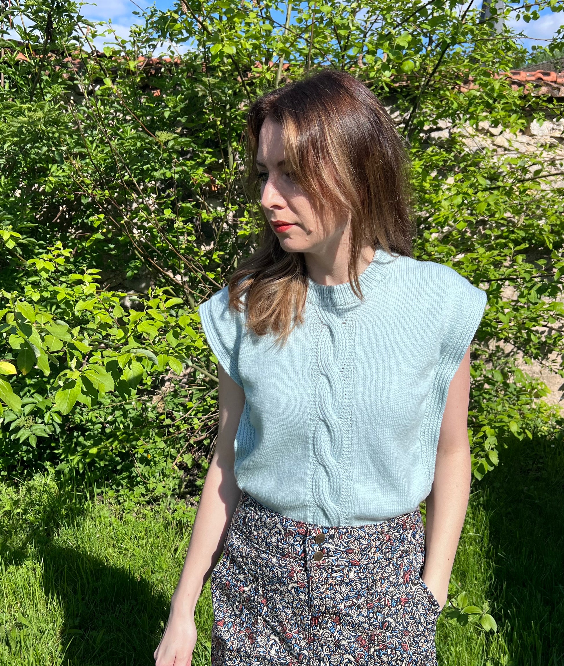 Le Slipover MIAMI se tricote en jersey de haut en bas avec un fil Fingering en bébé mérinos. On commence par le dos, puis les épaules sont tricotées séparément avant de rejoindre le dos pour tricoter en rond, en formant les emmanchures par des augmentations. Le bas est terminé par des côtes fantaisie. Le col se tricote en rond avec deux options : col simple ou double. Enfin, deux bandes sont tricotées puis cousues discrètement, avec une finition soignée aux emmanchures au crochet ou en i-cord.